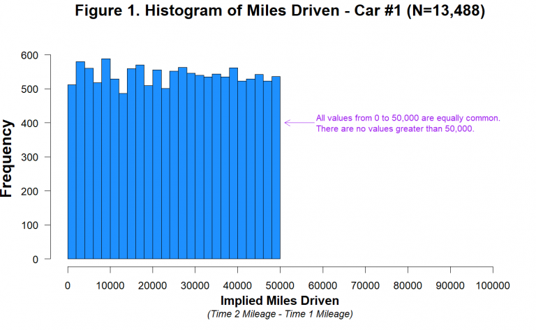 As noted by the authors of the 2012 paper, it is unknown how much time elapsed between the baseline period (Time 1) and their experiment (Time 2), and it was reportedly different for different customers [3]. For some customers the “miles driven” measure may reflect a 2-year period, while for others it may be considerably more or less than that [4]. It is therefore hard to know what the distribution of miles driven should look like in those data. It is not hard, however, to know what it should not look like. It should not look like this: