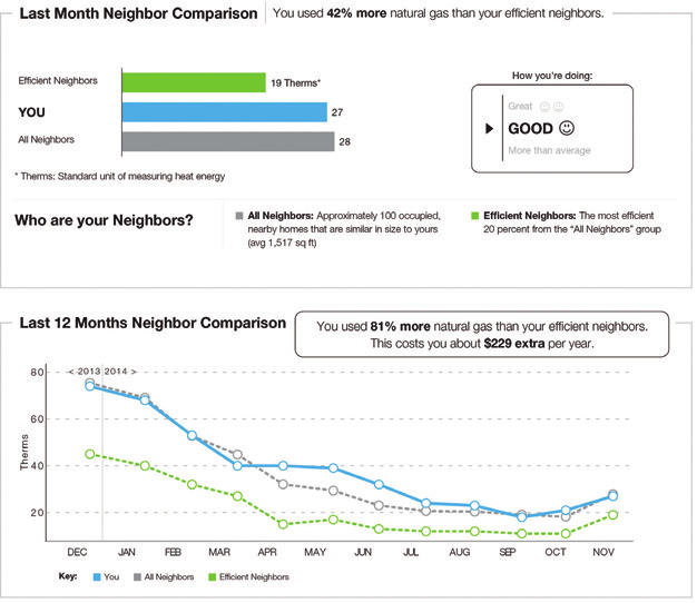 One method to achieve this is to give that person or household a comparison of their power consumption with that of their neighbours. People have a desire to conform, and look to cues to inform their decisions. If shown that their power usage is above their neighbours, they tend to reduce their use.